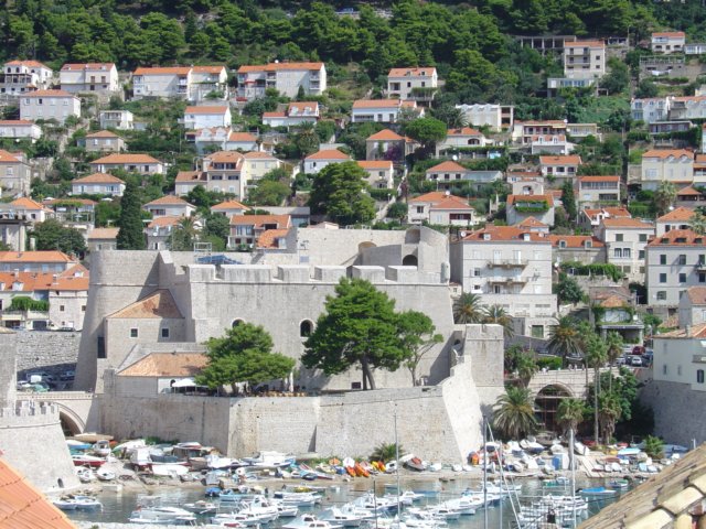 De haven van de oude stad Dubrovnik. Daarachter het fort nabij de haven en op de bergflanken de 'nieuwe' stad.